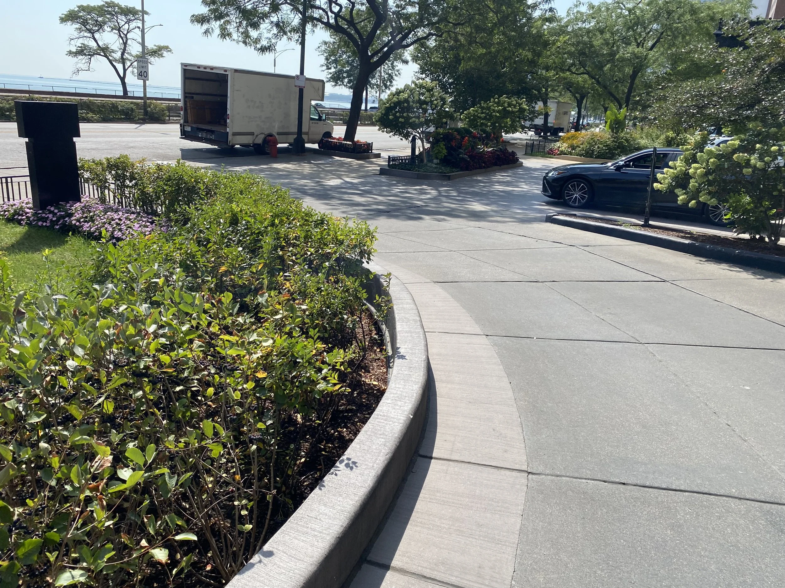 The Lake Shore Condominium is a 35-story multi-family residential building featuring a large concrete canopy over the east entry drive. The lower levels include a three-story parking garage, with one level of underground parking extending beneath the front entry drive and canopy. The u-shaped front entry drive surrounds a landscaped area at the building’s main entrance.