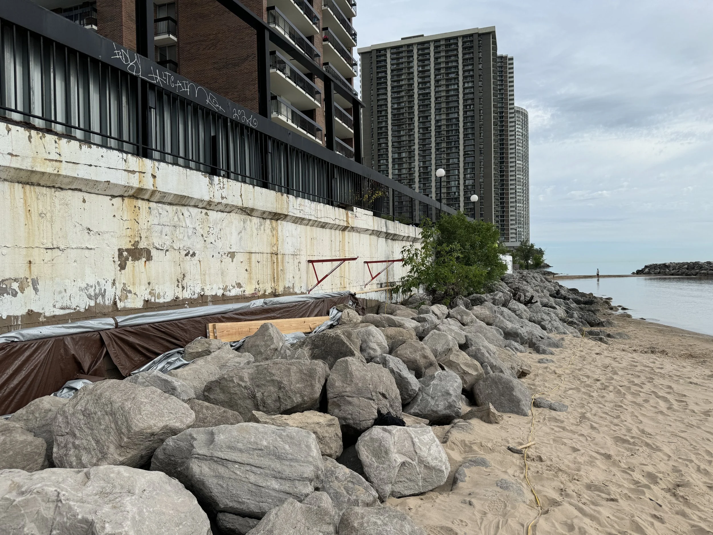 Thorndale Beach North Condominiums, also known as the Bob Newhart Building, is a 16-story mid-century condominium located on the lakeshore. A seawall runs along the east and north sides of the property to protect the building from high tides. The seawall consists of a steel sheet piling foundation topped with a reinforced concrete wall, with large boulders lining the base of the beach-facing sides.