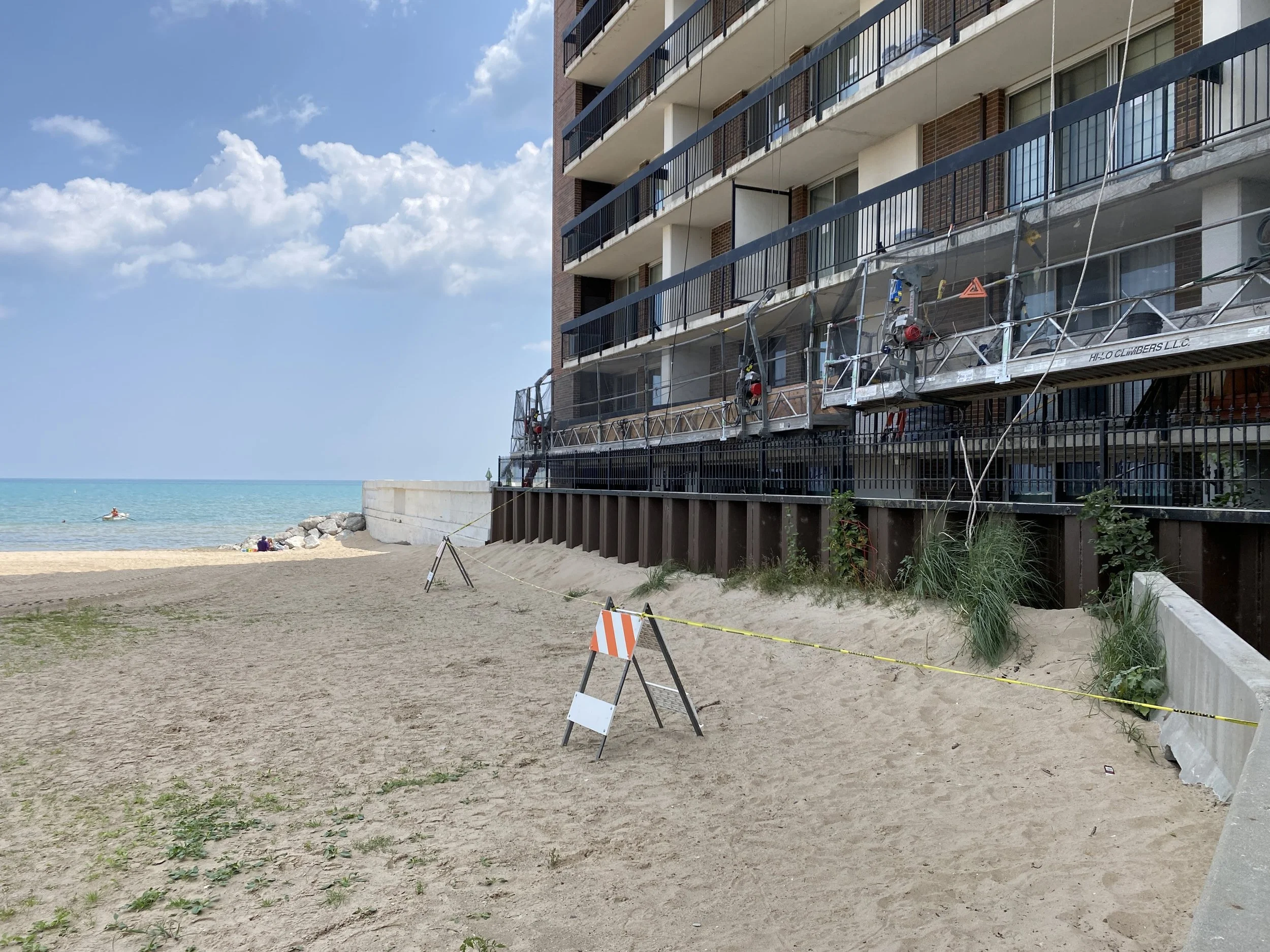 The Thorndale Beach North Condominium, also known as the Bob Newhart Building, is a 16-story residential structure. The building features exterior walls composed of exposed concrete structural elements, including columns and projecting balconies, along with masonry cladding and aluminum-framed windows and balcony doors. The structural system consists of conventional reinforced, cast-in-place concrete framing, with eight-inch-thick flat slabs that extend outward to form balconies on all elevations. The facade is further complemented by brick veneer masonry cladding, contributing to the building’s overall architectural character.